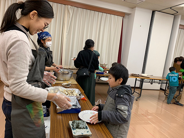 明成校下の方を対象に木曜日(月に1回)夕食を30食提供。「みんなが笑顔で食事をする場を作りたい、地域に住む方々との交流の場を作りたい」という思いで活動しています。