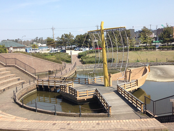 潮の香りと港の景観を楽しみながら遊ぶことができます。広々とした芝生広場にはすべり台やブランコがあり、緑地中央部には池と北前船をイメージした水上ステージ、その周りには観覧席が設置されています。 船や釣り人を見たり、夕方には日本海に沈む真っ赤な夕日を見ることのできる港の公園です。 近接には大野からくり記念館があります。こちらも楽しめますよ。