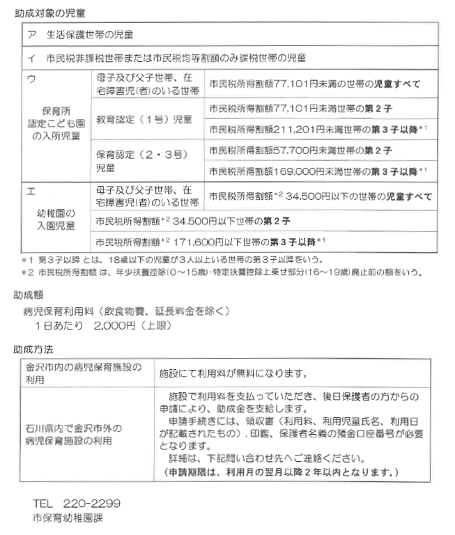 金沢市では、現在8か所の病院・診療所で病児一時保育のサービスがおこなわれています。子どもが病気になり、保護者が仕事の都合で世話ができないときの強い味方です。定員に限りがあるので、場合によってはキャンセル待ちになることもあります。