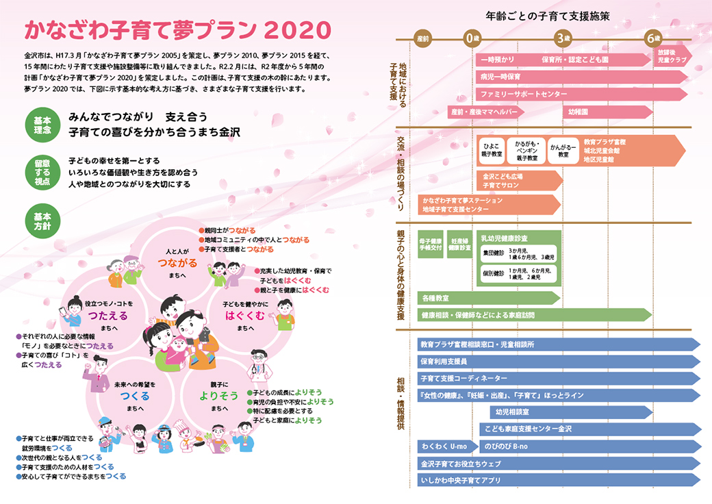 金沢市は、H17.3月 「かなざわ子育て夢プラン2005」 を策定し、夢プラン2010、夢プラン2015を経て、 15年間にわたり子育て支援や施設整備等に取り組んできました。R2.2月には、R2年度から5年間の計画「かなざわ子育て夢プラン2020」を策定しました。この計画は、子育て支援の木の幹にあたります。夢プラン2020では、下図に示す基本的な考え方に基づき、さまざまな子育て支援を行います。